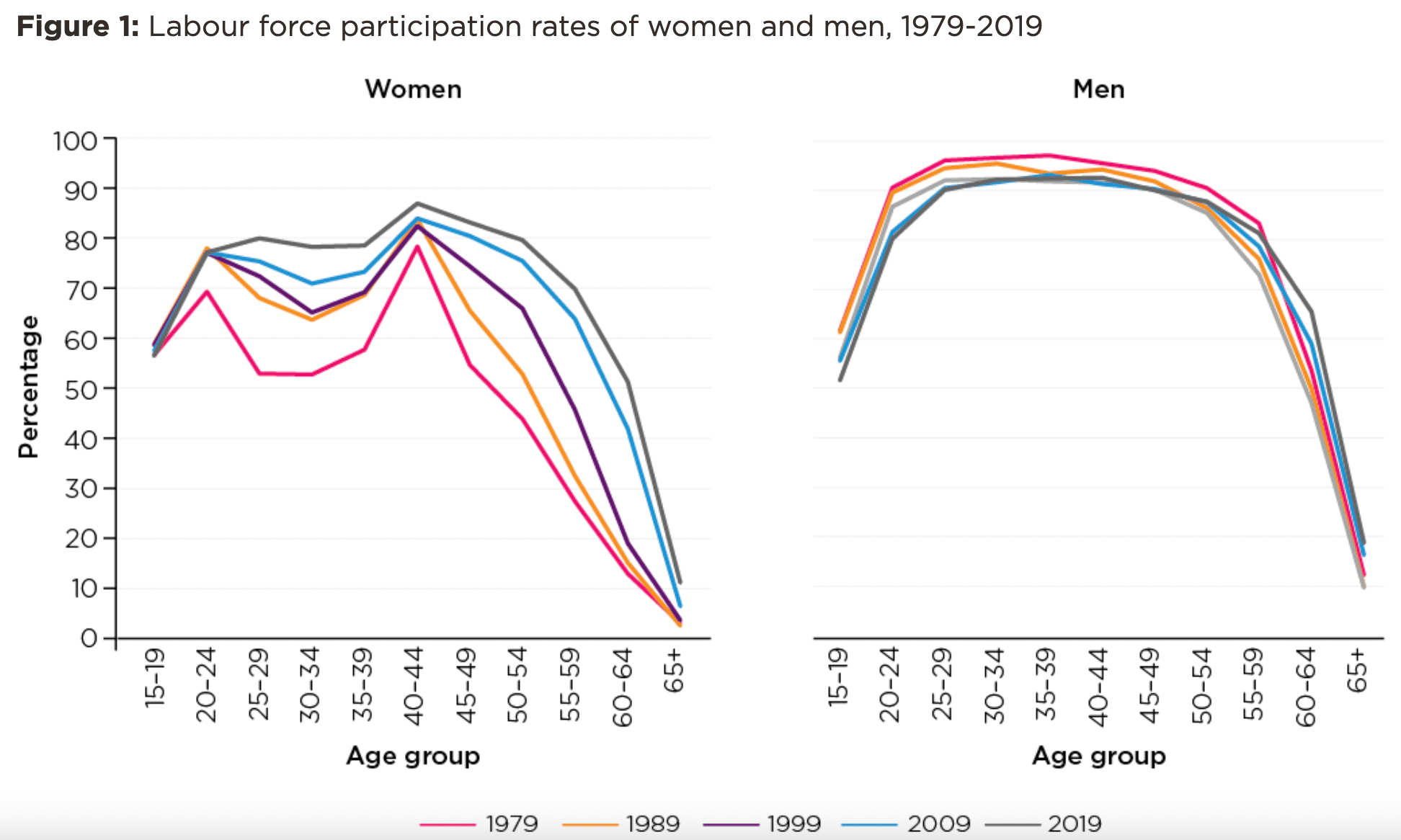 The graph below from the Australian Institute of Family Studies shows the jump over 40 years of women in their 30s in the workforce... from 50% to nearly 80%. And it's still mostly women that opt to take time out of their careers to raise kids. Recent data from our Workplace Gender Equality Agency suggests only 17% of parental leave was taken by men! So while there's good legislation in place to drag things onto equal footing, culturally, we're still figuring things out...